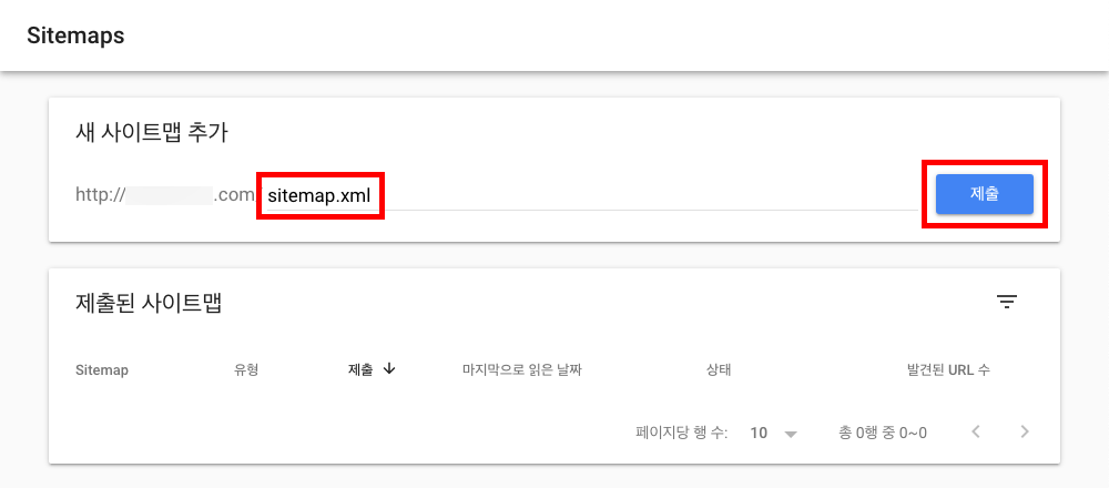 - 새 사이트맵 추가에서 sitemap.xml 을 입력하고, 제출 버튼을 클릭합니다.