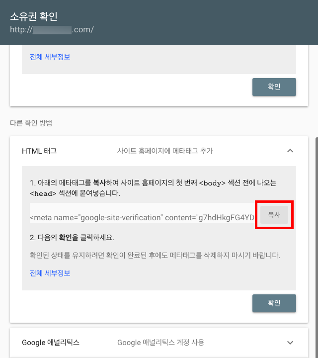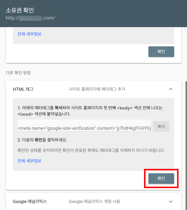7. 기존에 열려있던 구글 서치 콘솔창으로 돌아가 확인 버튼을 눌러줍니다.