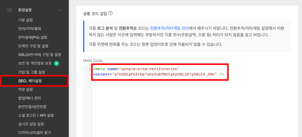 공통 코드 삽입 항목의 Meta Code에 복사한 메타태그를 붙여넣은 후 저장 버튼을 클릭합니다.