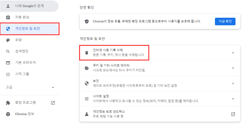 2. 그 다음 좌측 개인정보 및 보안을 클릭하여 인터넷 사용 기록 삭제를 클릭합니다.