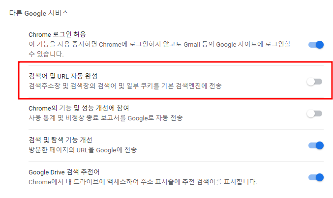 2. 검색어 및 URL 자동 완성 설정 부분을 클릭하여 비활성화 해주시면 완료됩니다.