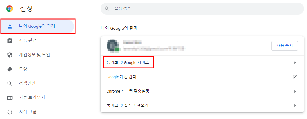 '나와 Google의 관계' 탭에 있는 '동기화 및 Google 서비스'를 클릭합니다.