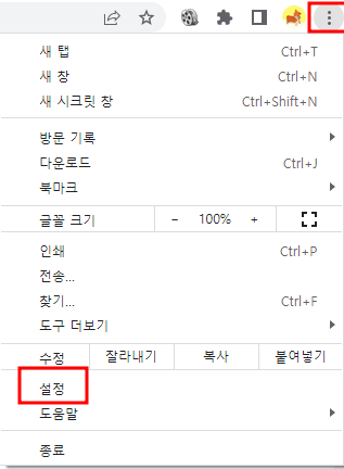 1. 우선 크롬 우측 상단에 있는 세개의 점을 클릭하여 설정으로 들어갑니다.
